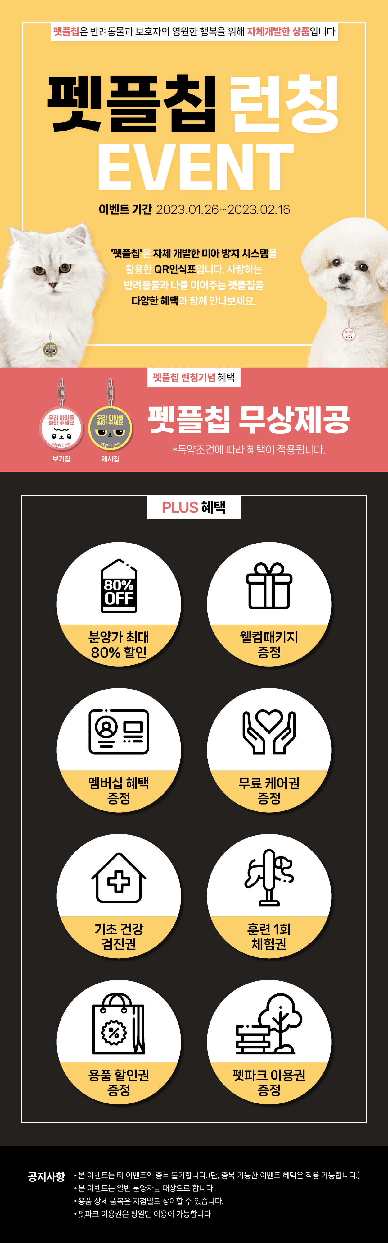✔ 최대 80% 분양가 할인 / 웰컴 패키지 증정 / 기초 건강검진 / 멤버십 혜택 / 무료케어권 증정 / 펫파크 이용권 / 용품할인권 / 훈련 체험권